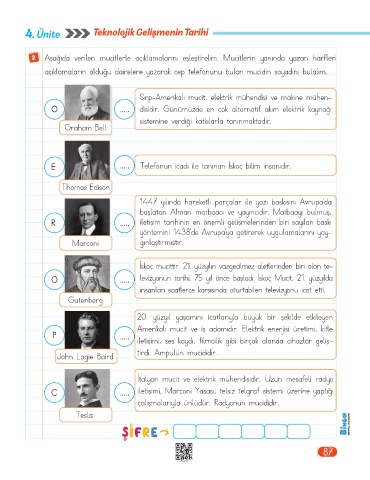 2 Aşağıda verilen mucitlerle açıklamalarını eşleştirelim. Mucitlerin yanında yazan harfleri