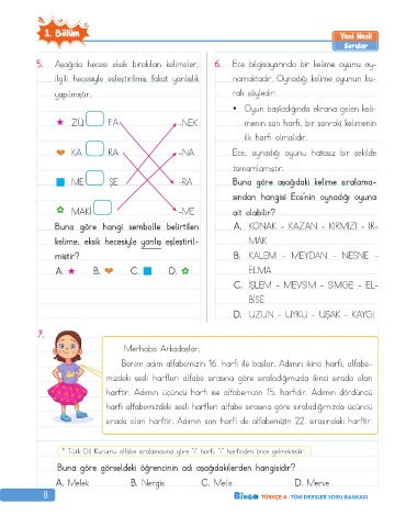 5. Aşağıda hecesi eksik bırakılan kelimeler, 6. Ece bilgisayarında bir kelime oyunu oy-