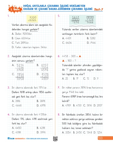 1. Ünite EKSİLEN VE ÇIKANI BULMA-ZİHİNDEN ÇIKARMA İŞLEMİ Test-7