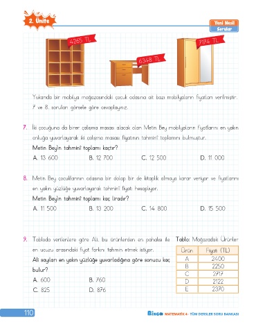 8. Metin Bey çocuklarının odasına bir dolap bir de kitaplık almaya karar veriyor ve fiyatlarını