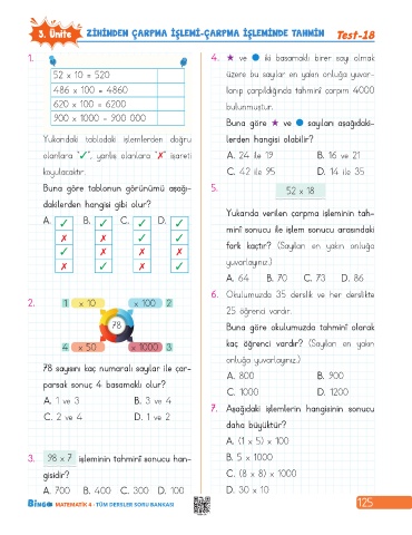 3. Ünite ZİHİNDEN ÇARPMA İŞLEMİ-ÇARPMA İŞLEMİNDE TAHMİN Test-18