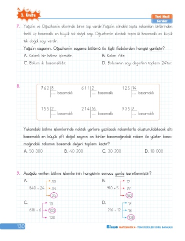 C. Bölüm iki basamaklıdır. D. Bölünenin sayı değerleri toplamı 24’tür.