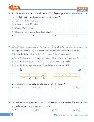 8. Kalanlı bölme işleminde bölen 44, bölüm 33 olduğuna göre bu bölme işleminde bölü-