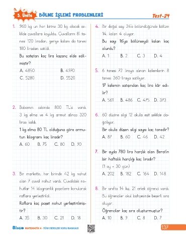 3. Ünite BÖLME İŞLEMİ PROBLEMLERİ Test-24