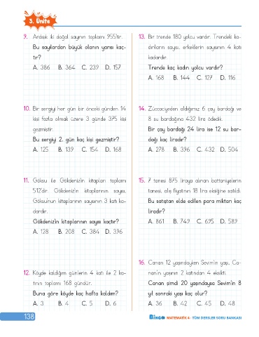 9. Ardışık iki doğal sayının toplamı 955’tir. 13. Bir trende 180 yolcu vardır. Trendeki ka-