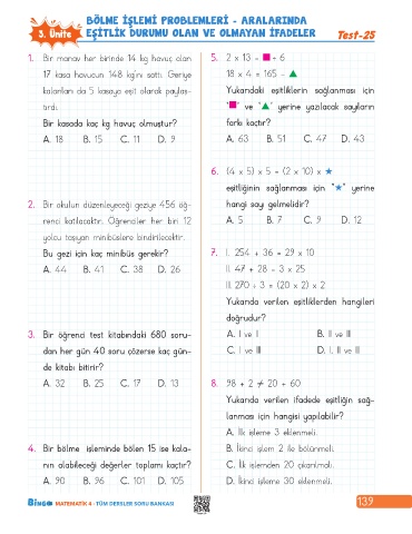 3. Ünite EŞİTLİK DURUMU OLAN VE OLMAYAN İFADELER Test-25