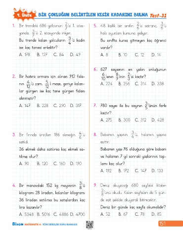 4. Ünite BİR ÇOKLUĞUN BELİRTİLEN KESİR KADARINI BULMA Test-31