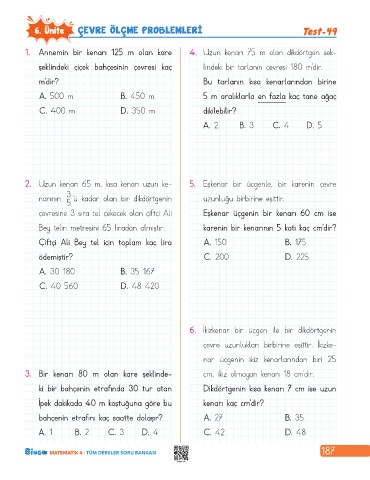 2. Uzun kenarı 65 m, kısa kenarı uzun ke- 5. Eşkenar bir üçgenle, bir karenin çevre