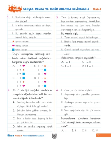 1. Bölüm GERÇEK, MECAZ VE TERİM ANLAMLI KELİMELER-1 Test-6