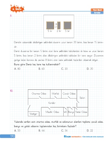 Deniz’in odasındaki dikdörtgen şeklindeki duvarın uzun kenarı 20 birim, kısa kenarı 15 birim-