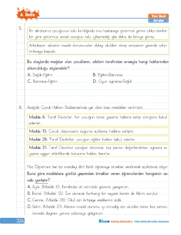 6. Aşağıda Çocuk Hakları Sözleşmesi’nde yer alan bazı maddeler verilmiştir.