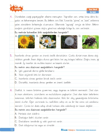 4. Günebakan çiçeği papatyagiller ailesine mensuptur. Yaprakları sarı, ortası biraz daha ko-