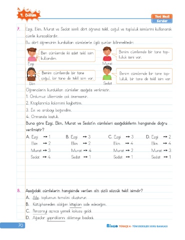 7. Ezgi, Ekin, Murat ve Sedat isimli dört öğrenci tekil, çoğul ve topluluk isimlerini kullanarak