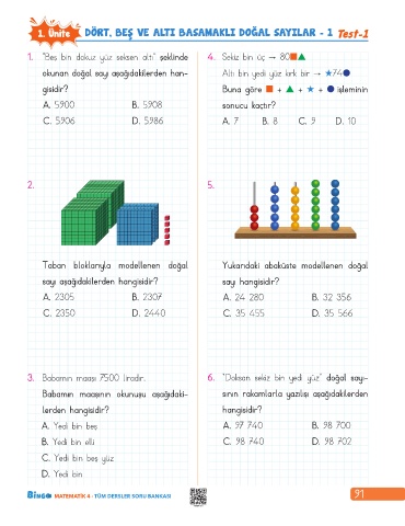 1. Ünite DÖRT, BEŞ VE ALTI BASAMAKLI DOĞAL SAYILAR - 1 Test-1