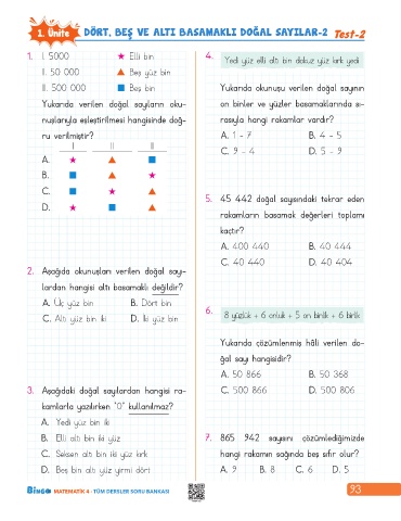1. Ünite DÖRT, BEŞ VE ALTI BASAMAKLI DOĞAL SAYILAR-2 Test-2