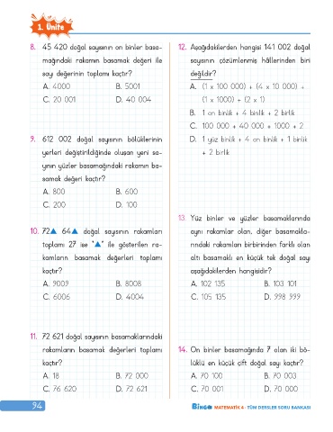 8. 45 420 doğal sayısının on binler basa- 12. Aşağıdakilerden hangisi 141 002 doğal