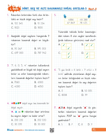1. Ünite DÖRT, BEŞ VE ALTI BASAMAKLI DOĞAL SAYILAR-3 Test-3