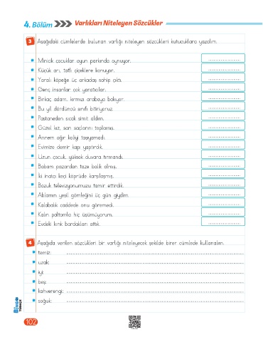 4 Aşağıda verilen sözcükleri bir varlığı niteleyecek şekilde birer cümlede kullanalım.