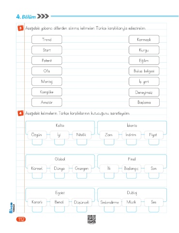 4 Aşağıdaki kelimelerin Türkçe karşılıklarının kutucuğunu işaretleyelim.