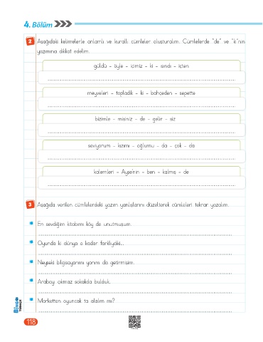 2 Aşağıdaki kelimelerle anlamlı ve kurallı cümleler oluşturalım. Cümlelerde “de” ve “ki”nin