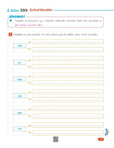 1 Aşağıdaki eş sesli sözcükleri iki farklı anlama gelecek şekilde cümle içinde kullanalım.