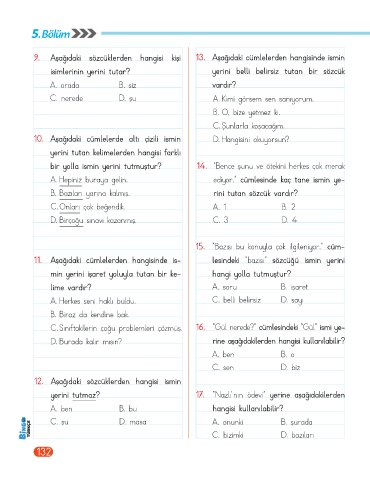 9. Aşağıdaki sözcüklerden hangisi kişi 13. Aşağıdaki cümlelerden hangisinde ismin