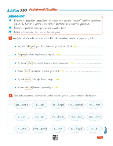 2 Aşağıdaki pekiştirmeli kelimelerde verilen noktalı yerleri uygun harflerle dolduralım.