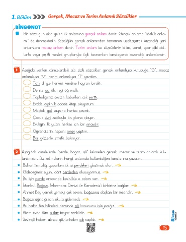 2 Aşağıdaki cümlelerde “perde, boğaz, ışık” kelimeleri gerçek, mecaz ve terim anlamlı kul-