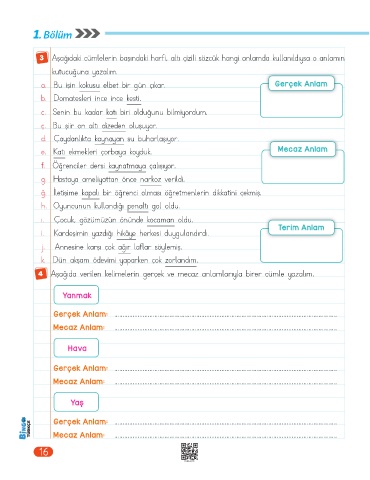 4 Aşağıda verilen kelimelerin gerçek ve mecaz anlamlarıyla birer cümle yazalım.