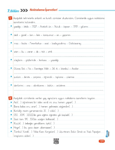 1 Aşağıdaki kelimelerle anlamlı ve kurallı cümleler oluşturalım. Cümlelerde uygun noktalama