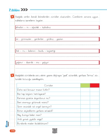 3 Aşağıdaki cümlelerde soru ekinin yazımı doğruysa "yeşil” sütundaki, yanlışsa "kırmızı” sü-