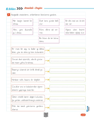 1 Aşağıdaki atasözlerini, anlamlarının karşılarına yazalım.