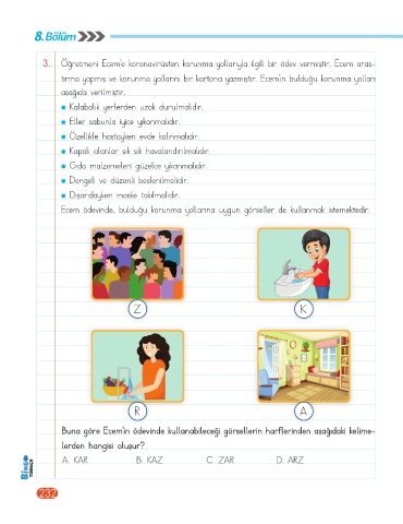 3. Öğretmeni Ecem’e koronavirüsten korunma yollarıyla ilgili bir ödev vermiştir. Ecem araş-