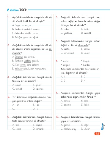 5. Aşağıdaki kelimelerden hangisi birden 10. Aşağıdaki kelimelerden hangisi türemiş
