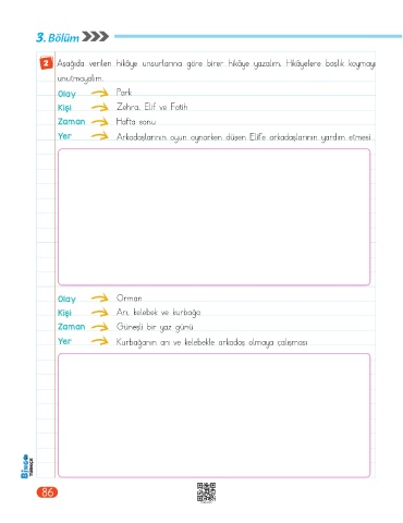 2 Aşağıda verilen hikâye unsurlarına göre birer hikâye yazalım. Hikâyelere başlık koymayı