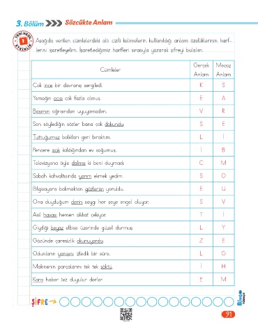 1 Aşağıda verilen cümlelerdeki altı çizili kelimelerin kullanıldığı anlam özelliklerinin harf-