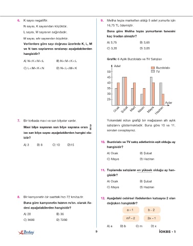 6. K sayısı negatiftir. 9. Meliha teyze marketten aldığı 5 adet yumurta için
