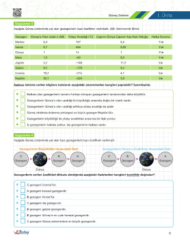 Aşağıda Güneş sisteminde yer alan gezegenlerin bazı özellikleri verilmiştir. (AB: Astronomik Birim)