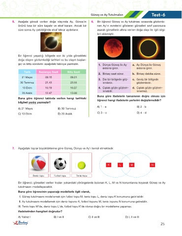 5. Aşağıda görseli verilen doğa olayında Ay, Güneş’in 6. Bir öğrenci Güneş ve Ay tutulması sırasında gözlemle-