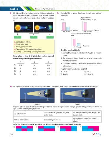 8. Bir öğrenci 2 ile gösterilen yere her iki tutulmada görü- 9. Aşağıda Güneş ve Ay tutulması ile ilgili bazı grafikler