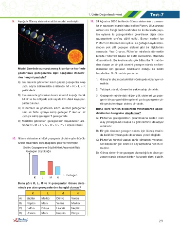 9. Aşağıda Güneş sistemine ait bir model verilmiştir. 11. 24 Ağustos 2006 tarihinde Güneş sisteminin o zaman-
