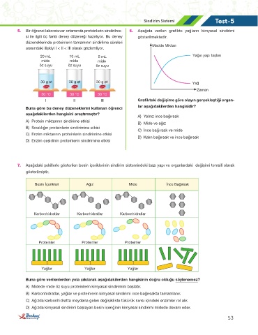 5. Bir öğrenci laboratuvar ortamında proteinlerin sindirilme- 6. Aşağıda verilen grafikte yağların kimyasal sindirimi