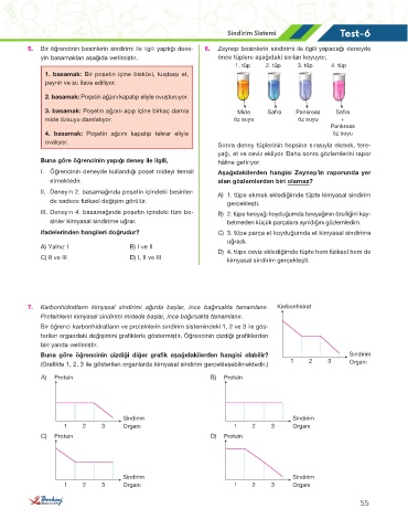 5. Bir öğrencinin besinlerin sindirimi ile ilgili yaptığı dene- 6. Zeynep besinlerin sindirimi ile ilgili yapacağı deneyde