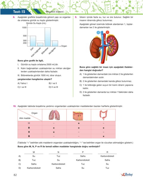 8. Aşağıdaki grafikte boşaltımda görevli yapı ve organlar- 9. İdrarın içinde fazla su, tuz ve üre bulunur. Sağlıklı bir