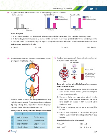 14. Aşağıda vücudumuzda bulunan K ve L damarlarıyla ilgili grafikler verilmiştir.