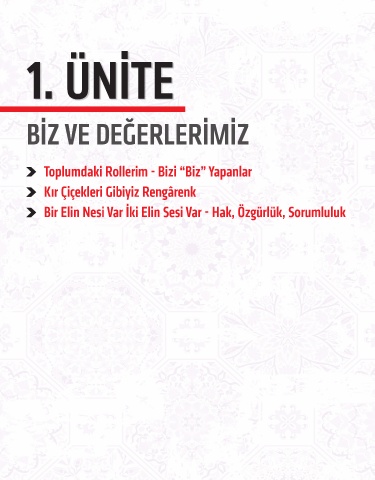 1. ÜNİTE BİZ VE DEĞERLERİMİZ Toplumdaki Rollerim - Bizi “Biz” Yapanlar Kır Çiçekleri Gibiyiz Rengârenk Bir Elin Nesi Var İki Elin Sesi Var - Hak, Özgürlük, Sorumluluk