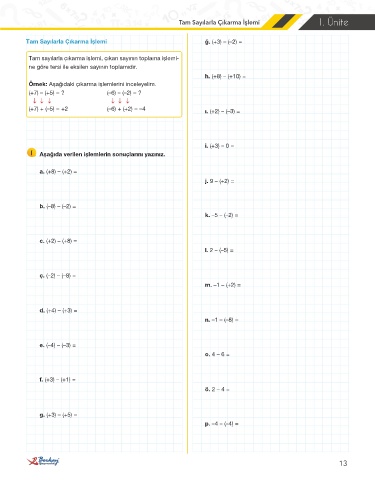 Tam Sayılarla Çıkarma İşlemi 1. Ünite