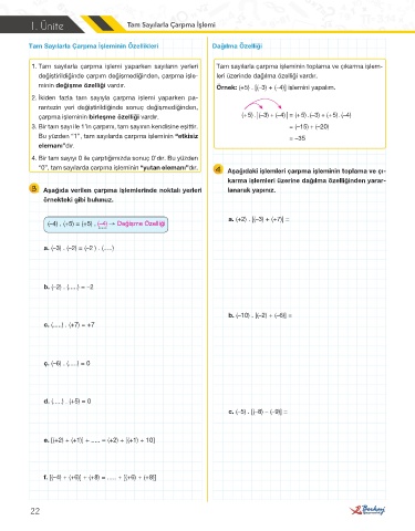 “0”, tam sayılarda çarpma işleminin “yutan elemanı”dır. 4 Aşağıdaki işlemleri çarpma işleminin toplama ve çı-