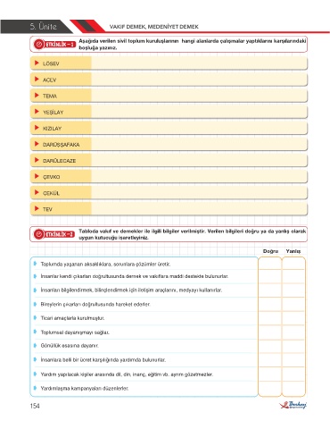 Tabloda vakıf ve dernekler ile ilgili bilgiler verilmiştir. Verilen bilgileri doğru ya da yanlış olarak