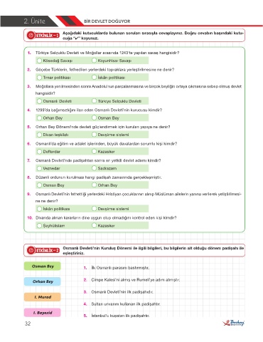 Osmanlı Devleti’nin Kuruluş Dönemi ile ilgili bilgileri, bu bilgilerin ait olduğu dönem padişahı ile